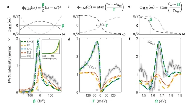 图3. 由三种不同相位函数(包括泡利阻塞、激子-激子相互作用、非谐振子和双能级系统)引起的 FWM,实验与三种理论模型的对比