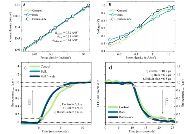 图2:a钙钛矿探测器改性后Jsc与P的线性曲线图;b Voc与P的关系曲线图。c器件上升时间响应动态特性;d器件的下降时间d响应动态特性