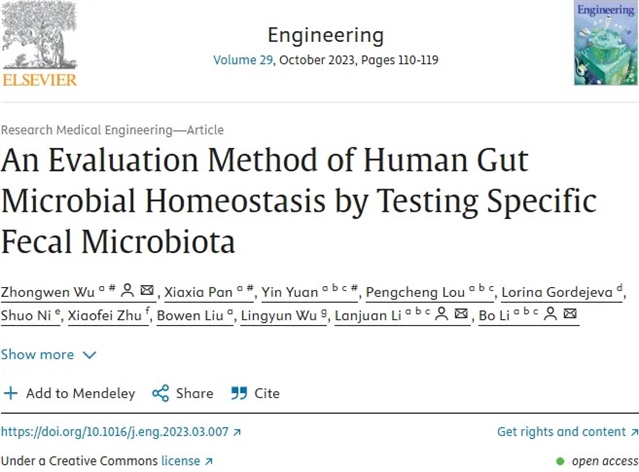 浙江大学医学院附属第一医院传染病诊治国家重点实验室李兰娟院士团队在《Engineering》发表题为“An Evaluation Method of Human Gut Microbial Homeostasis by Testing Specific Fecal Microbiota”的研究论文,成功建立了一种通过检测特定肠道菌群评估人体肠道微生态平衡的新方法,为相关疾病的诊断和治疗提供了有力支持。吴仲文、潘厦厦、袁音为共同第一作者,吴仲文、李兰娟、李博为通讯作者。