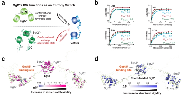 图3:Sgt2的IDR通过调控分子构象熵,实现了无需直接接触的远程自抑制和激活机制,从而动态切换蛋白的结合能力。