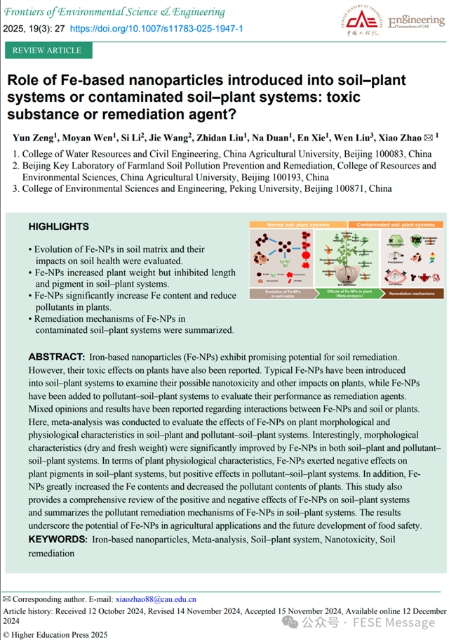 本文内容来自FESE期刊2025年第19卷第3期发表的综述文章“Role of Fe-based nanoparticles introduced into soil–plant systems or contaminated soil–plant systems: toxic substance or remediation agent?”。通讯作者为中国农业大学的赵枭副教授。