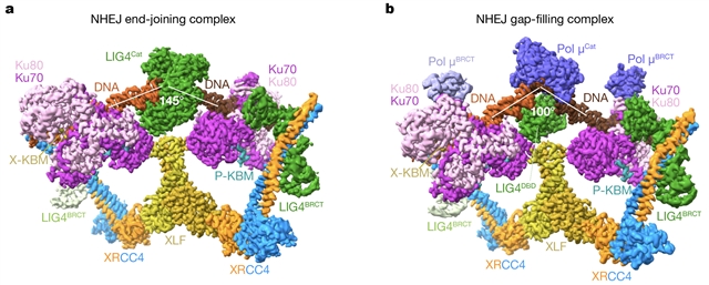 图1 NHEJ ligation (a) 和gap-filling (b) 复合物电镜结构。
