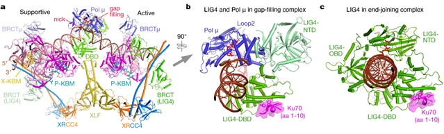 (1) 两种复合物具有相似的结构框架。两个KU分别结合在两段DNA上,XRCC4-XLF-XRCC4形成ω型框架,并通过LIG4 BRCT结构域结合在两个KU上,因此两段DNA被固定在同一个复合物中(图1)。这种结构框架的弹性支持gap-filling和ligation之间的构象转变。