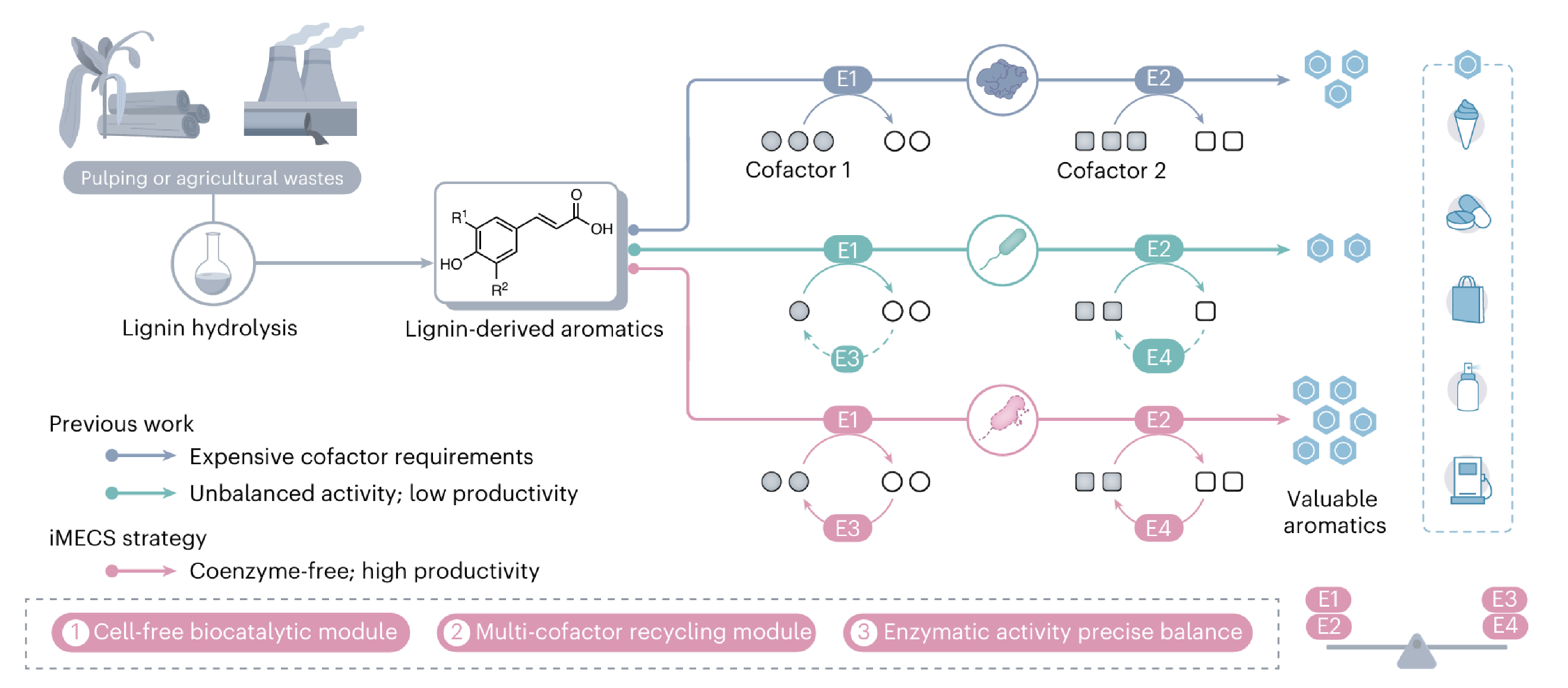 香料类天然产物合成共有三种路线,包括传统路线中的依赖纯化酶进行生物催化,以及利用微生物进行全细胞催化。本研究提出的iMECS策略则结合了两者的优点,通过体外多酶协调表达和辅因子自循环系统,能够实现了高效、低成本的木质素转化。