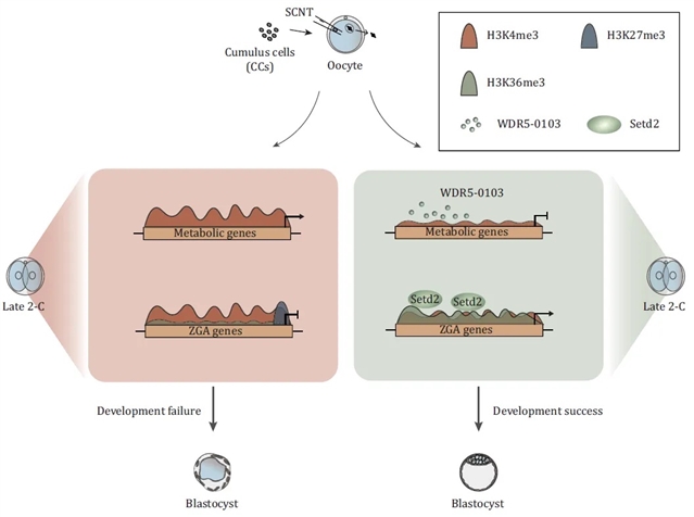 本研究证实,组蛋白H3K4me3和H3K27me3修饰在核移植胚胎合子基因激活时期均存在过度富集的情况, WDR5-0103的添加可以部分恢复核移植胚胎中过宽的H3K4me3修饰,最终提高核移植效率。Setd2的过表达可以通过在ZGA相关的二价基因的基因体(gene body)区重建H3K36me3修饰,同时排除其启动子区的H3K27me3修饰,恢复其表达水平,最终显著提高核移植的囊胚率。