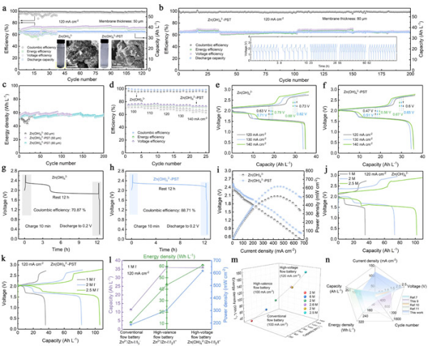 该研究在设计高电压锌碘液流电池基础上,通过在碱性锌负极添加同时具备含氧功能性官能团及电荷载体的酒石酸钾钠,实现了对电解液离子结构-电极界面传质行为的有效调控,电池输出功率密度达到616 mW cm−2,有效提升22.8%,并在140 mA cm−2电密运行下实现71.5%的能量转换效率。更重要的是,2.5 M高浓度电解液可在120 mA cm−2下有效提升容量及能量密度至105.98 Ah L−1和185.18 Wh L−1。材料表征结果表明,酒石酸钾钠显著调控了锌离子的原始配位平衡,加速了脱溶剂化过程。同时,酒石酸钾钠在电极表面优先吸附形成屏蔽层,均匀诱导锌离子迁移通量,优化了电流密度分布,克服了枝晶生长及死锌累积的缺陷。此外,酒石酸钾钠通过氢键相互作用破坏了水分子间的原始氢键网络,减少了电解液中自由水的数量,显著抑制了析氢副反应。