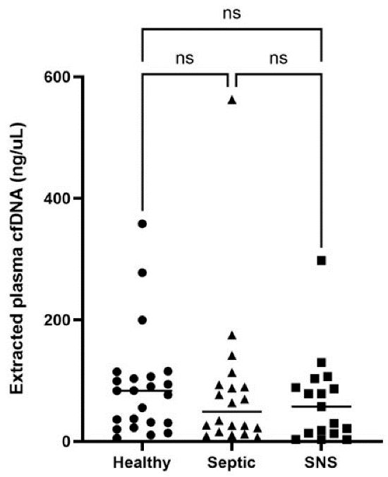 健康、脓毒症和患病 (非脓毒症) (SNS) 小马驹提取的cfDNA浓度比较。显著性设置为p < 0.05。ns = 不显著