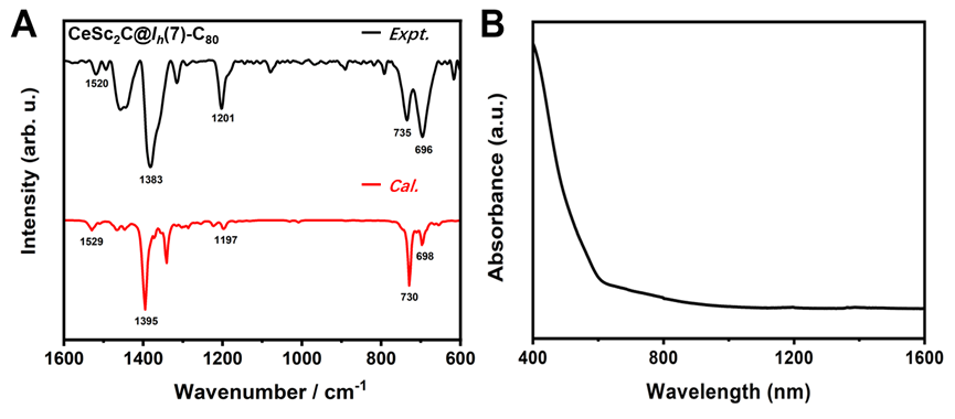 图2:CeCSc2@C80的红外吸收光谱及其理论模拟和紫外-可见-近红外吸收光谱。