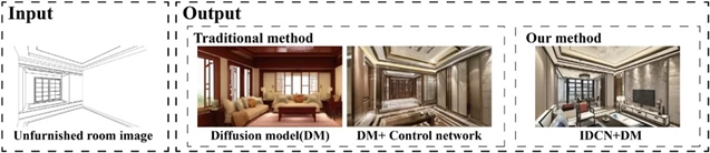 人工智能驱动的室内设计生成技术展现出广阔的应用前景。然而,当前基于人工智能的扩散模型在生成与室内结构像素级对齐的室内布局时仍存在挑战。本研究提出了一种基于稳定扩散(Stable Diffusion)的新型室内设计工作流程,并引入室内设计控制网络(IDCN)。IDCN 可确保基于未装修房间输入图像批量生成的创意室内设计方案与室内结构相匹配。通过该方法直接生成创新设计与渲染图像,能够省去传统设计实践中繁琐的创意设计与绘图工作。研究结果表明,采用这种新设计方法的技术可实现近实时的设计生成与修改,显著提升设计创意性与效率。此外,该方法可推广至其他设计生成任务,从而推动设计向智能化转型。