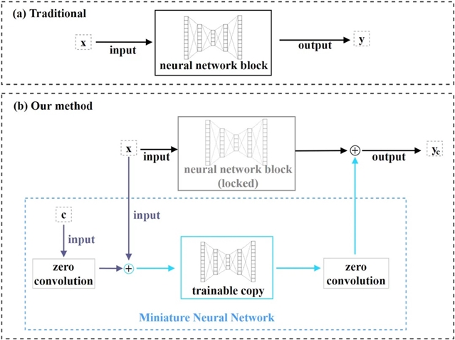 ▲ 图三:基于 IDCN 的框架设计。文中所提出的框架通过将额外训练的小型神经网络与预训练扩散模型并行连接,实现对输出结果的调控。©本文作者