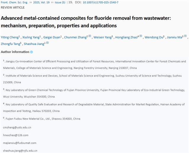 Yiting Cheng, Xiuling Yang, Gaigai Duan, Chunmei Zhang, Weisen Yang, Hongliang Zhao, Wendong Du, Jianxiu Ma, Zhongfu Tang, Shaohua Jiang. Advanced metal-contained composites for fluoride removal from wastewater: mechanism, preparation, properties and applications. Front. Chem. Sci. Eng., 2025, 19(5): 39 https://doi.org/10.1007/s11705-025-2540-7