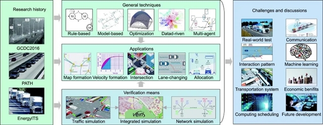 信号交叉口处的编队调度:操纵车辆方法通过调整速度、分离编队等策略使车辆在绿灯期间通过交叉口;操纵交通灯方法调整信号灯偏移量等,目前多数研究处于仿真阶段,未来需扩展到大规模交叉口网络。